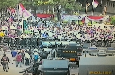 Polisi membubarkan massa dengan menembakkan gas air mata dan water cannon, setelah para demonstran memaksakan diri untuk masuk dan menerobos barikade polisi.