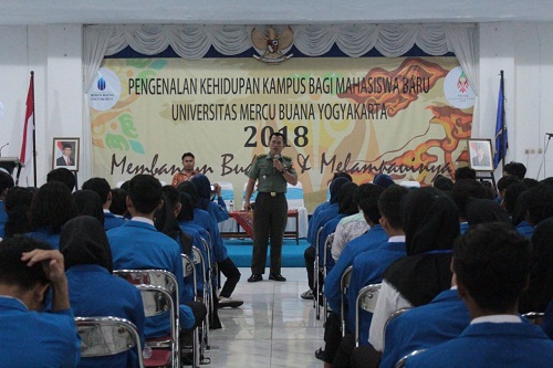 YOGYAKARTA – Sekira seribuan Mahasiswa Baru (Maba) Universitas Mercu Buana (UMB) Yogyakarta, mendapatkan sosialisasi anti radikalisme dan terorisme dari Kepala Staf Kodim 0734/Yogyakarta, Mayor Inf Minasik, Rabu, (12/09/2018).