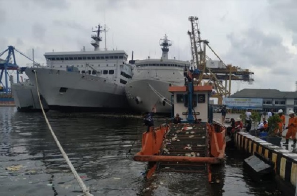 Petugas beserta prajurit Kolinlamil memungut seluruh sampah yang mengapung di laut kemudian di bawa ke darat untuk diangkut dengan truk sampah.