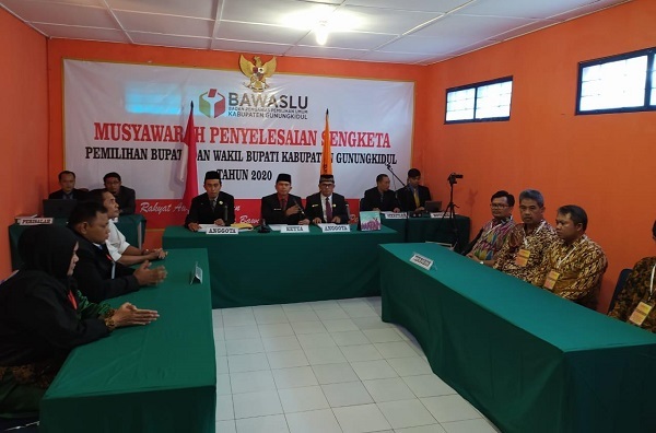 GUNUNGKIDUL – Dalam Musyawarah Lanjutan terkait Penyelesaian Sengketa Pemilihan dengan pemohon Pasangan Bakal Calon perseorangan pada Pemilihan Bupati dan Wakil Bupati 2020 di Kabupaten Gunungkidul, Ir. H. Kelick Agung Nugroho – Yayuk Kristyawati (Kelik-Yayuk), Badan Pengawas Pemilu (Bawaslu) Kabupaten Gunungkidul, akhirnya menyampaikan putusan.