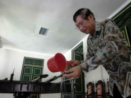Dengan menggunakan meja panjang, dua pusaka itu satu persatu dibersihkan dengan siraman air bunga. Setelah itu, dengan menggunakan kuas beberapa bagian yang berkarat digosok selanjutnya diberi minyak cendana yang sebelumnya diolesi dengan warangan.