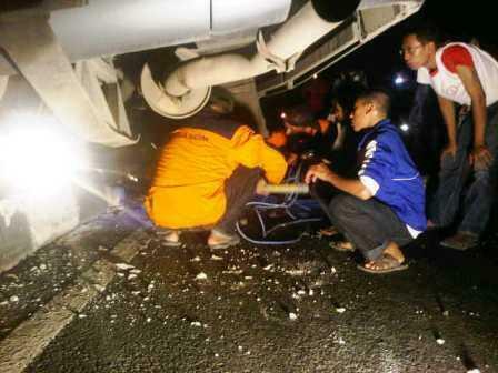 Anggota Pareanom, Hartanto yang turut mengevakuasi badan bus menerangkan, kondisi bus terbalik setelah mengalami ban pecah pada sisi kiri. “Sebagian badan masuk ke jalur lambat,” ujarnya di lokasi kejadian.