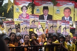 YOGYAKARTA – Kampanye terbuk Partai Golkar di Alun-alun Selatan Yogyakarta yang dihadiri ribuan kader dan simpatisan, Senin (17/03/2014) didominasi massa pendukung Siti Hediati Soeharto SE atau akrab disapa Titiek Soeharto. Tampak atribut yang dibawa hampir seluruhnya bergambar Titiek Soeharto yang meripakan Calon Legislatif (Caleg) Partai Golkar Nomor urut 1 untuk daerah pemilihan (Dapil) DIY tersebut.