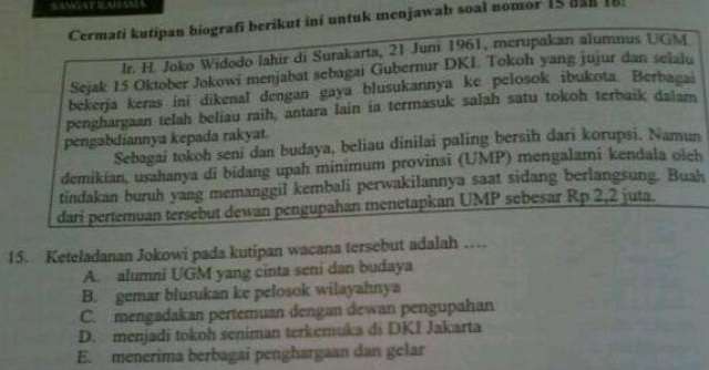 YOGYAKARTA – Munculnya profil Joko Widodo alias Jokowi dalam soal Ujian Nasional (UN) tingkat SLTA Tahun 2014, dinilai sarat unsur politik. Munculnya Profil Gubernur DKI Jakarta yang kini menjadi Calon Presiden (Capres) dari PDIP pada soal Bahasa Indonesia itu mendapat kecaman dari banyak pihak.
