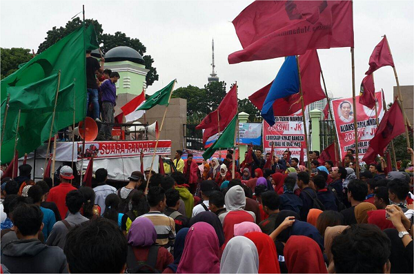 JAKARTA – Bertepatan dengan digelarnya sidang Mahkamah Kehormatan Dewan (MKD) terkait skandal Freeport, Ribuan massa gabungan mahasiswa dan elemen rakyat yang terhimpun dalam Aliansi Tarik Mandat (ATM) menggelar aksi unjuk rasa di depan Gedung DPR/MPR RI, Rabu (16/12/2015). Massa menuntut mendesak agar DPR/MPR menggelar Sidang Istimewa (SI), dan mengembalikan konstitusi kepada UUD 45 asli, yang sesuai rumusan PPKI 18 Agustus 1945 dan cabut mandat Joko Widodo – Jusuf Kalla (Jokowi-JK) sebagai Presiden dan wakil Presiden RI.