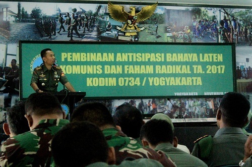 YOGYAKARTA – Sebagai upaya meningkatkan kewaspadaan terhadap ancaman bangkitnya kembali bahaya laten komunis dan faham radikalisme, Kodim 0734/Yogyakarta menggelar kegiatan Pembinaan Antisipasi Balatkom dan Faham Radikal Senin( 06/11/2017), di Aula Makodim 0734/Yogyakarta.