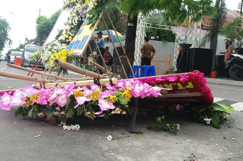 Petugas dan warga setempat dengan sigap mengangkat dan mendirikan kembali karangan. Bagian bawah kaki-kaki karangan bunga diberi pemberat agar lebih kokoh.