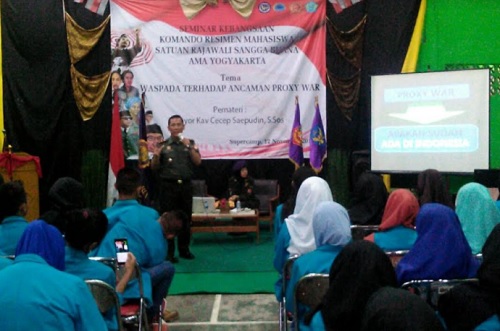 YOGYAKARTA – Komando Resimen Mahasiswa (Menwa) Satuan Rajawali Sangga Buana Akademi Manajemen Administrasi Yogyakarta (AMAYO) menggelar Seminar Kebangsaan di Aula AMAYO, Jalan Pramuka, Umbulharjo, Yogyakarta, Minggu (12/11/2017). Seminar bertemakan ‘Waspada Terhadap Ancaman Proxy War’ tersebut menghadirkan pembicara Komandan Koramil (Danramil) 07/Umbulharjo Kodim 0734/Yogyakarta, Mayor Kav Cecep Saepudin, S Sos.