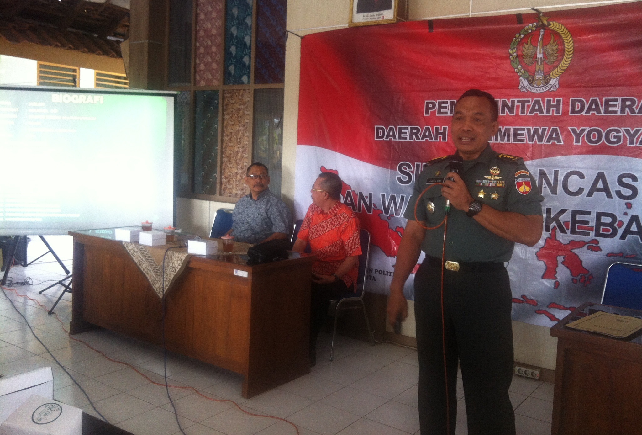 “Nilai kesatuan wilayah ini berarti bahwa kuatnya NKRI tidak bisa dilihat dati satu sisi saja, tapi semua sisi. Ya ekonominya harus kuat, politik kuat, pertahan dan keamanan juga kuat,” katanya di hadapan sedikitnya 80 peserta yang mewakili unsur pelajar, karang taruna, tokoh masyarakat dan tokoh agama dari Kecamatan Ngawen.