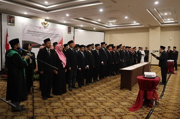 SLEMAN – Badan Pengawas Pemilu (Bawaslu) Kabupaten Sleman melantik dan mengambil sumpah Panitia Pengawas Kecamatan (Panwascam) untuk bertugas dalam Pemilihan Kepala Daerah (Pilkada) Sleman 2020, di Hotel Grand Keisha Yogyakarta, Senin (23/12/2019).