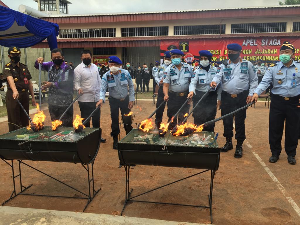 Yogyakarta – Bertempat di lapangan upacara Lembaga Pemasyarakatan (Lapas) Narkotika kelas IIA Yogyakarta, Kantor Wilayah (Kanwil) Kementerian Hukum dan HAM D.I. Yogyakarta menggelar Apel Siaga program Pencegahan dan Pemberantasan Penyalahgunaan dan Peredaran Gelap Narkotika dan Prekursor Narkotika (P4GN) sekaligus pemusnahan barang terlarang hasil penggeledahan P4GN pada Lapas Narkotika Kelas IIA Yogyakarta dan Lapas kelas IIA Yogyakarta, Rabu(30/9/2020).