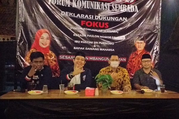 SLEMAN –Forum Komunikasi Sembada (FOKUS) mendeklarasikan dukungan bagi pasangan calon (Paslon) bupati dan wakil bupati Sleman nomor urut 3 Kustini Sri Purnomo-Danang Maharsa, Jumat (13/11/2020).
