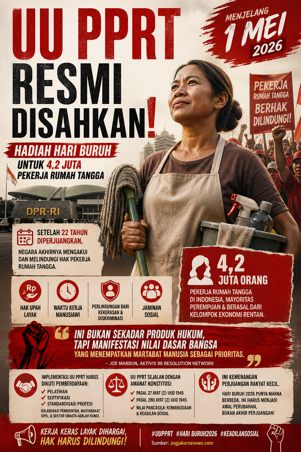 Jogjakartanews.com, Sleman – Pengesahan Undang-Undang Perlindungan Pekerja Rumah Tangga (UU PPRT) oleh DPR RI dinilai menjadi tonggak sejarah perlindungan pekerja domestik setelah diperjuangkan selama 22 tahun. Sejumlah aktivis menyebut pengesahan regulasi ini sebagai hadiah menjelang peringatan Hari Buruh Internasional, 1 Mei.